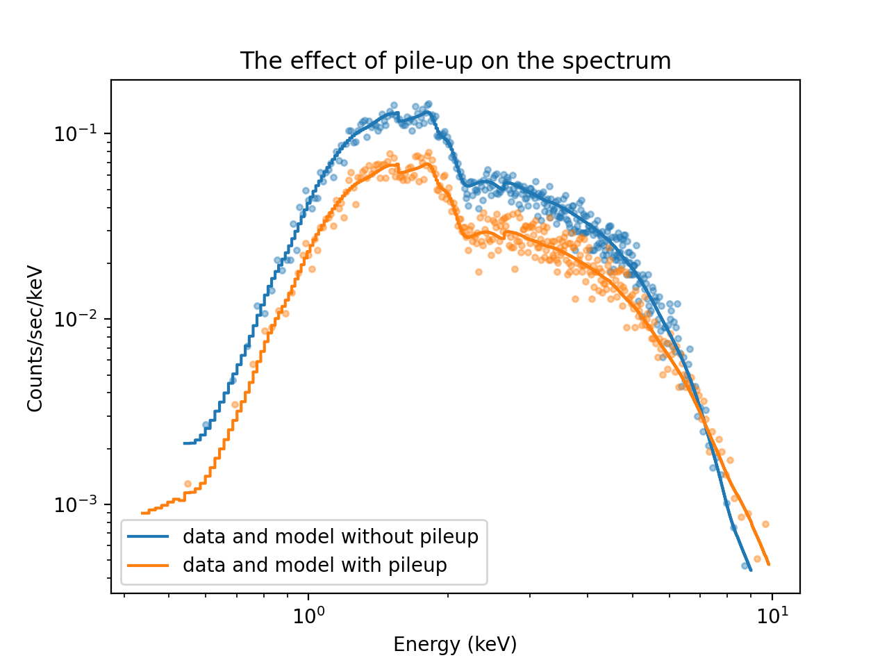 Comparing the spectrum simulated without pile-up and with pile-up shows how pile-up distorts the spectral shape. Pile-up reduces the number of counts overall because some events are combined with other events such that they look like a cosmic ray or some other background noise that is removed by Chandra’s grade filtering. Pile-up also hardens the spectrum because multiple low-energy photons are detected as single higher-energy events.