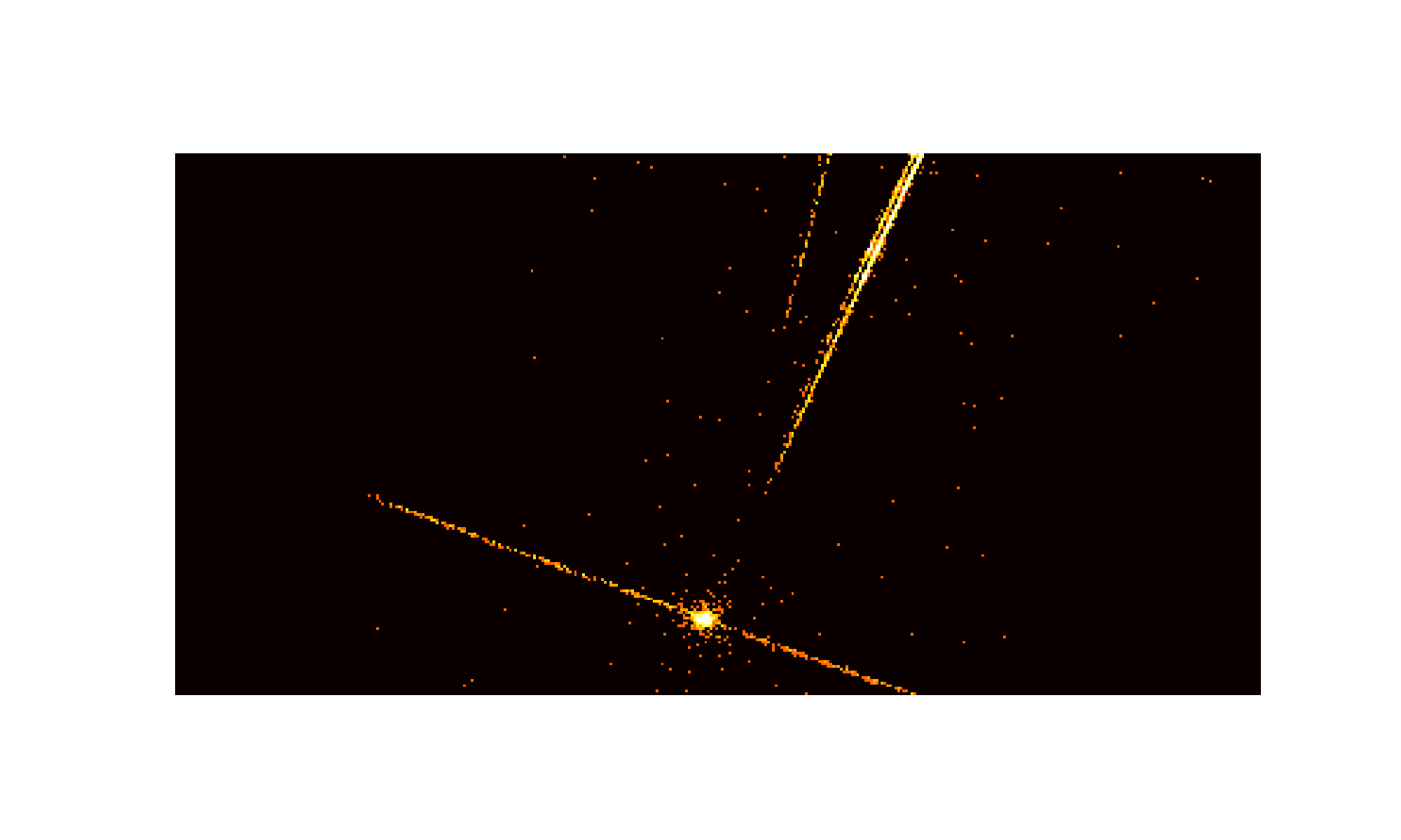The grating spectra of both sources are located fairly close to each other. On the top right is an MEG arm, the fainter signal of an HEG arm is seen on the top left. The streak running mostly from left to right with a slight downward slope is the read-out streak.